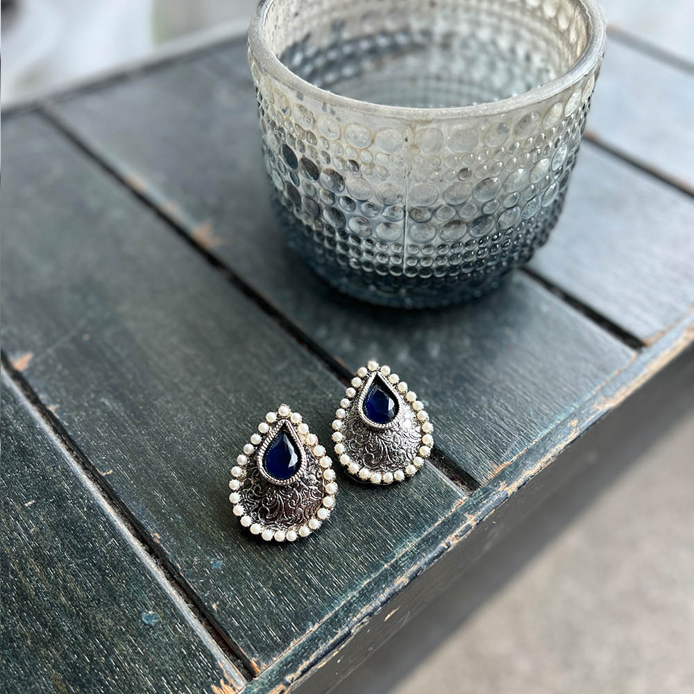 Silver traditional studs with a solid black real stone embedded in the center with tiny pearl detailing all around the structure.