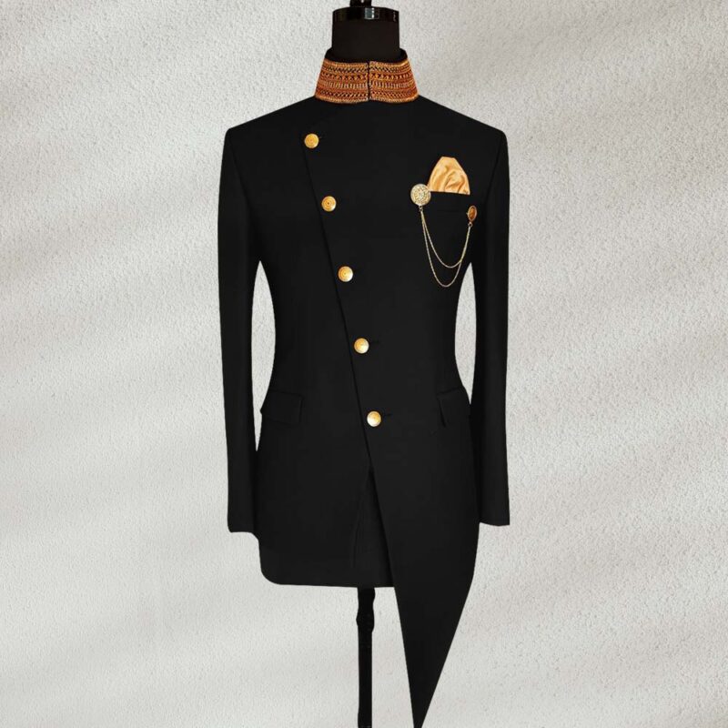 This Italian Woven Indo Western Bespoke Prince Suit will give you utmost comfort and smart fitting. To look elegantly smart get this black prince suit for special occasions, superbly designed with fantastic ban work.