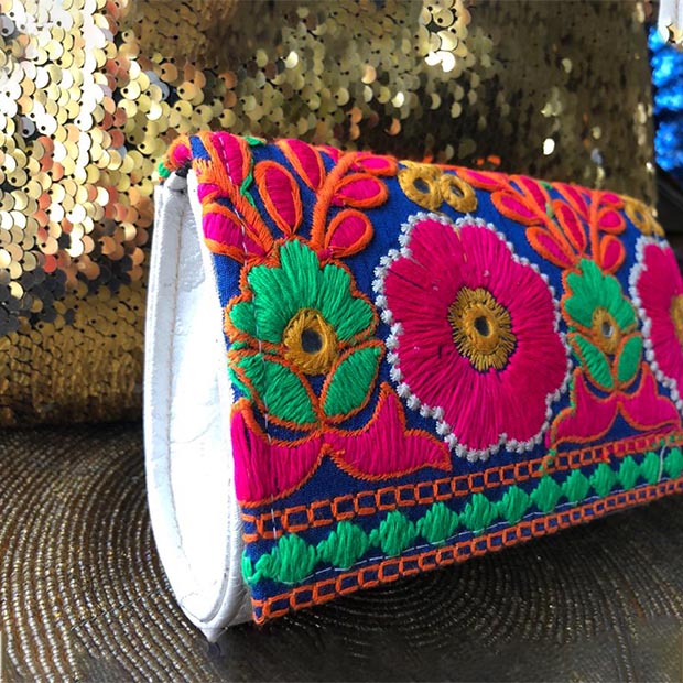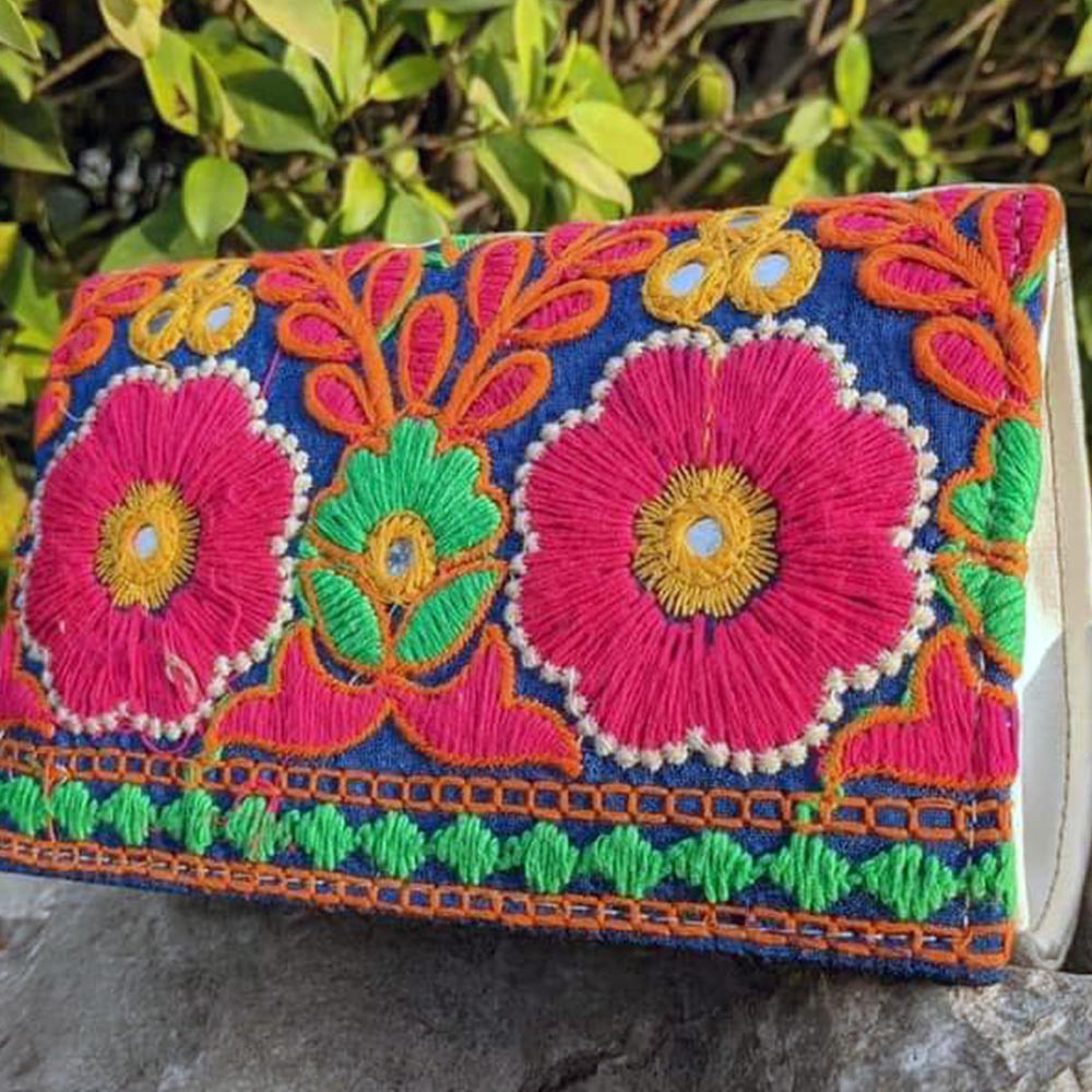 Dimensions 6.5/4.5 inches embroidered handy clutch for routine use. Every article contains a good quality chain inside.