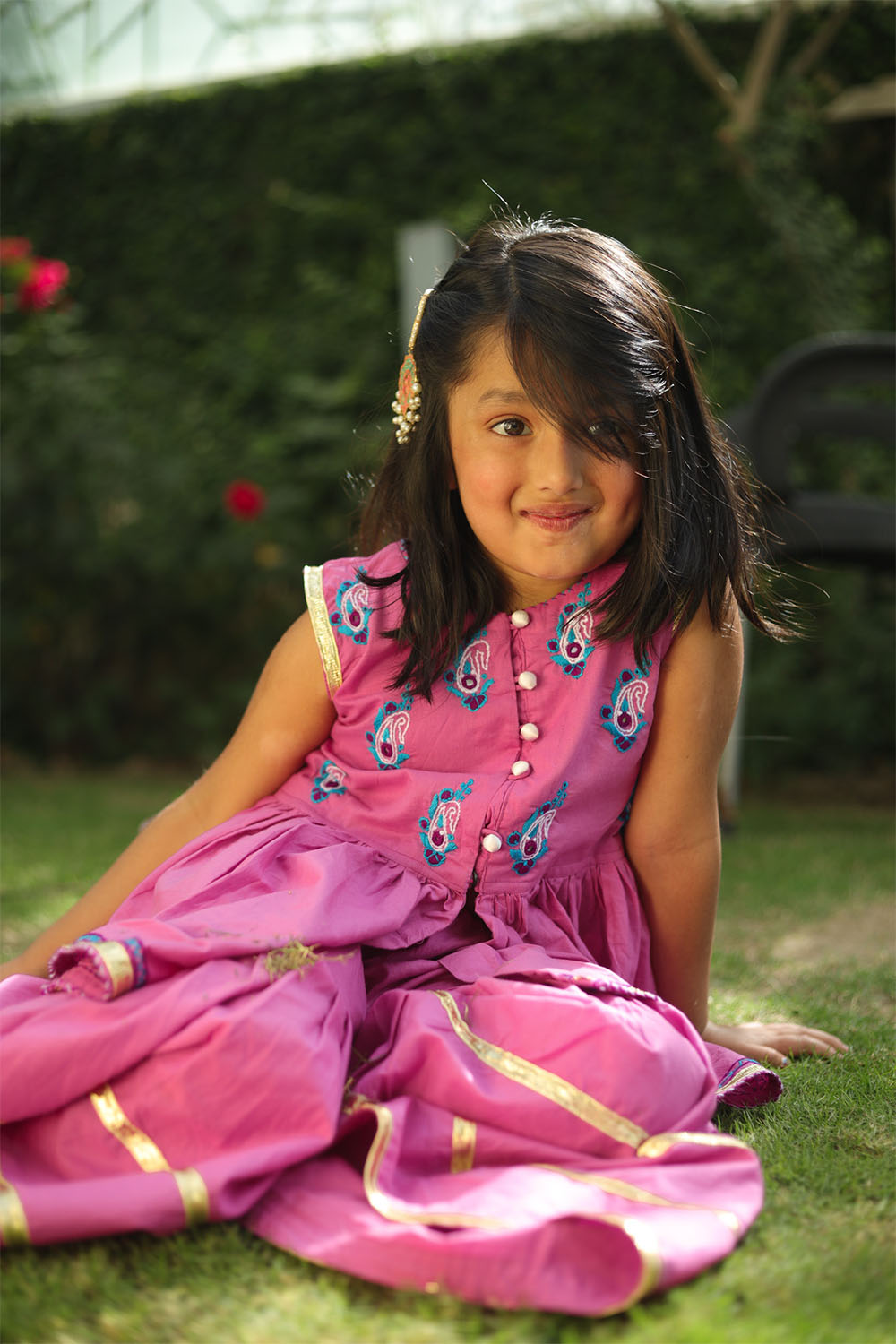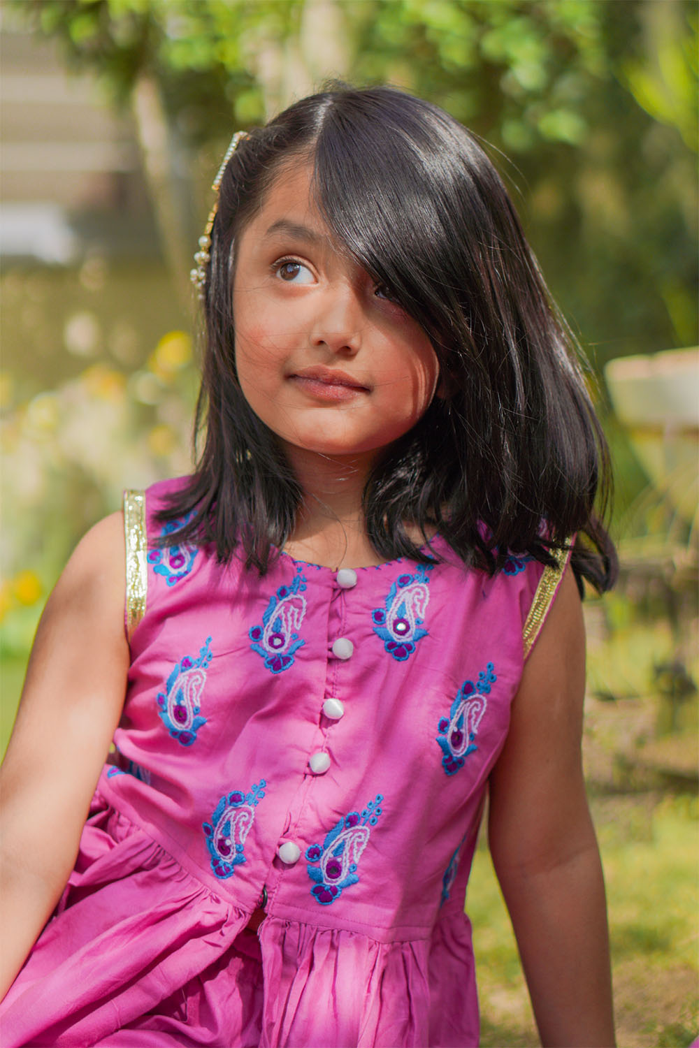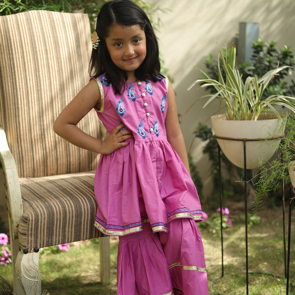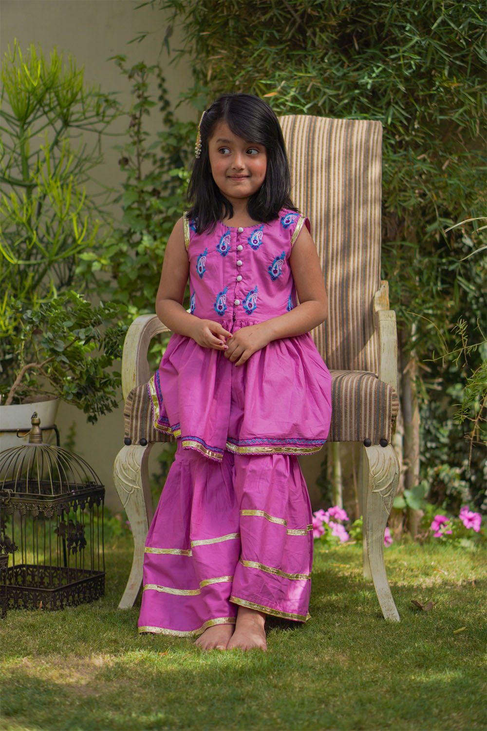 Hand embroidered button-up peplum paired with gharara pants with gotta lace on it