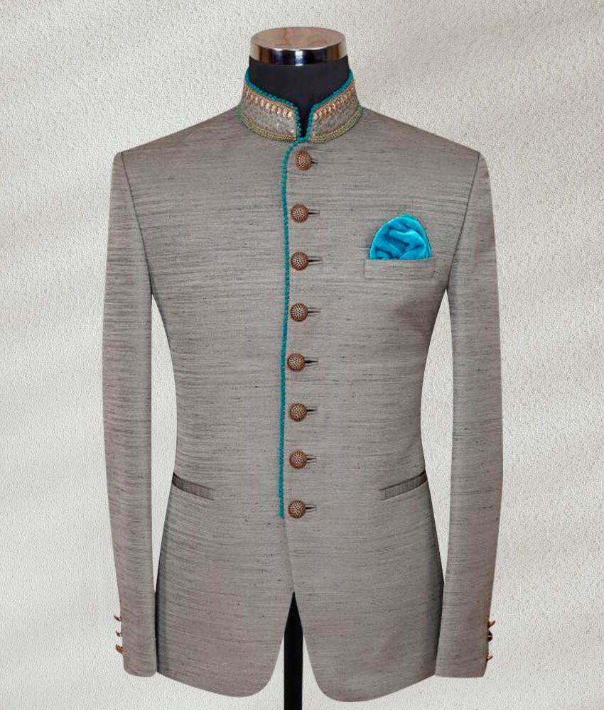 Mandarin collar Maroon plain pure indian jamawar side cut prince suit with cooper side buttons and stylish self print pocket square and “Chain Broach”, in addition of “light emroidary hand work” on coller will gives you complete royal look for any formal wedding event.