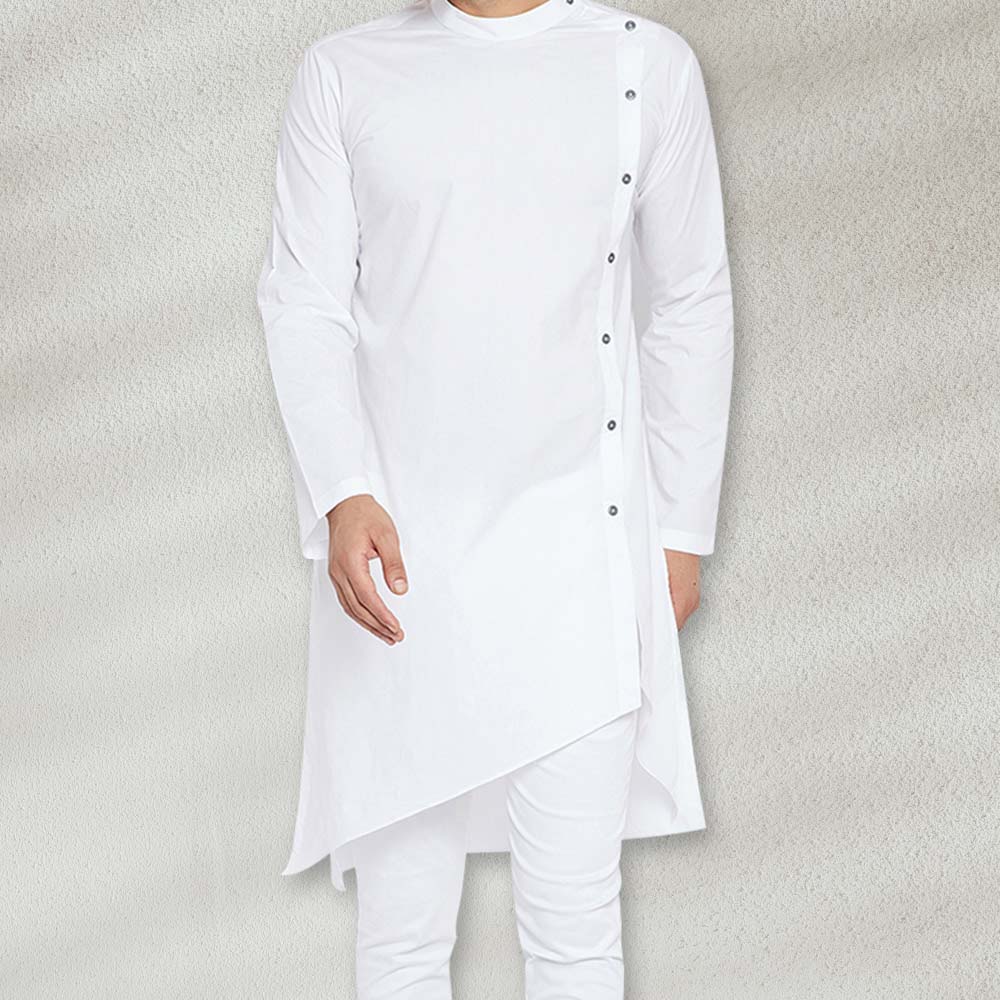 Trendy & stylish side cut white kurta is a great way to show off your style. You can wear it on special occasion or any other family event paired with a trouser.