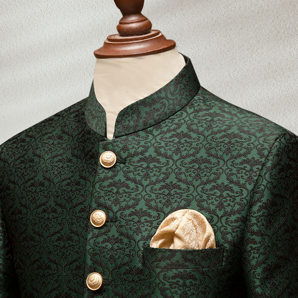 Shameel Khan’s this handmade Green & Black Self Textured Prince Coat truly represents eastern aesthetics and makes your special day exceptional for you.