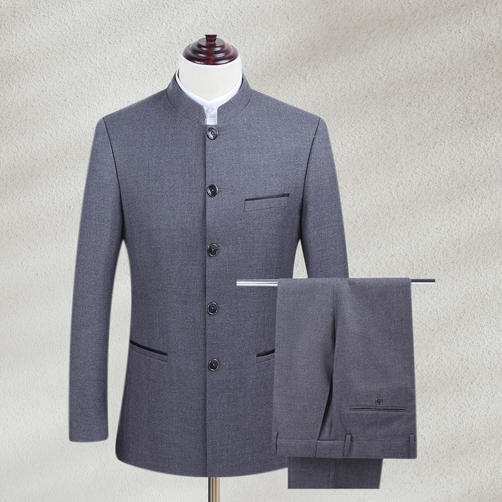 Italian tropical grey colored mandarin collar prince suit with delicate site pockets combine with elegant buttons on front, this fine stitched prince suit with same fabric dress pant makes it look more impact full.