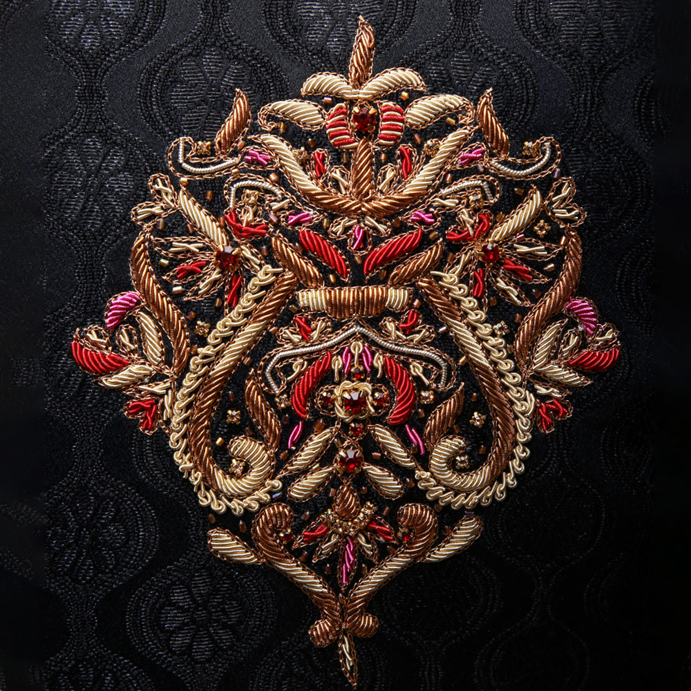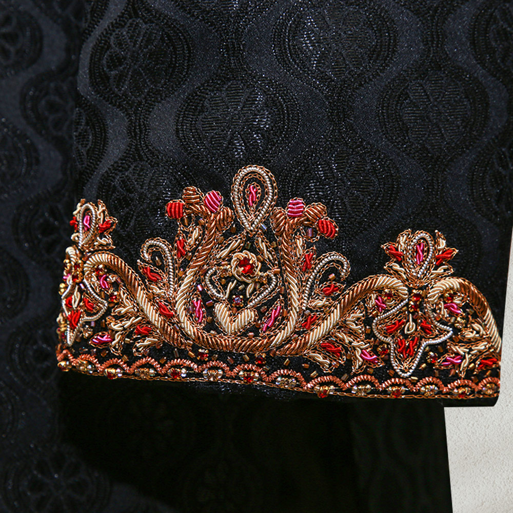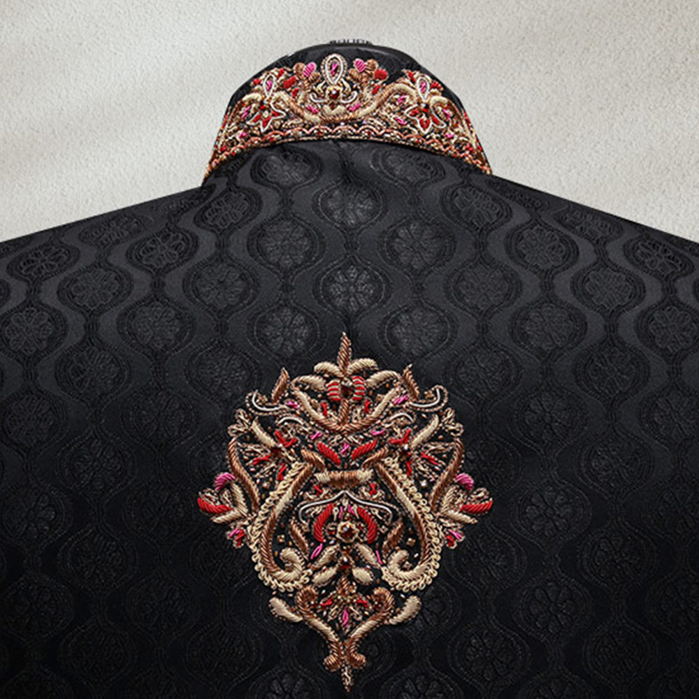Black Side Cut Self Textured Sherwani Hand Embroidery on Ban Collar, Cuffs, Front and Back Motif, can be worn with straight pants or trousers. This adequate sherwani gives you ampler look on your big day.