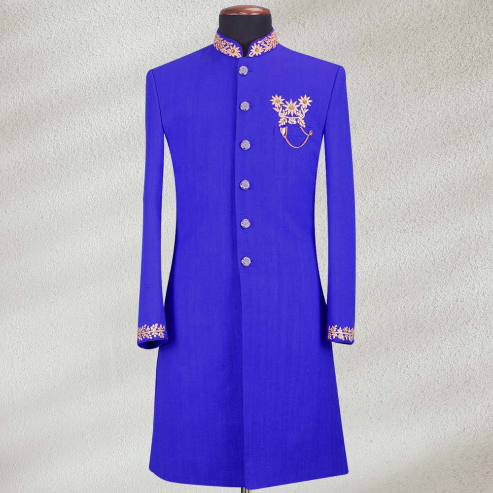 To look elegantly smart get this blue sherwani for special occasions, superbly designed with fantastic work on front, ban & sleeves.
