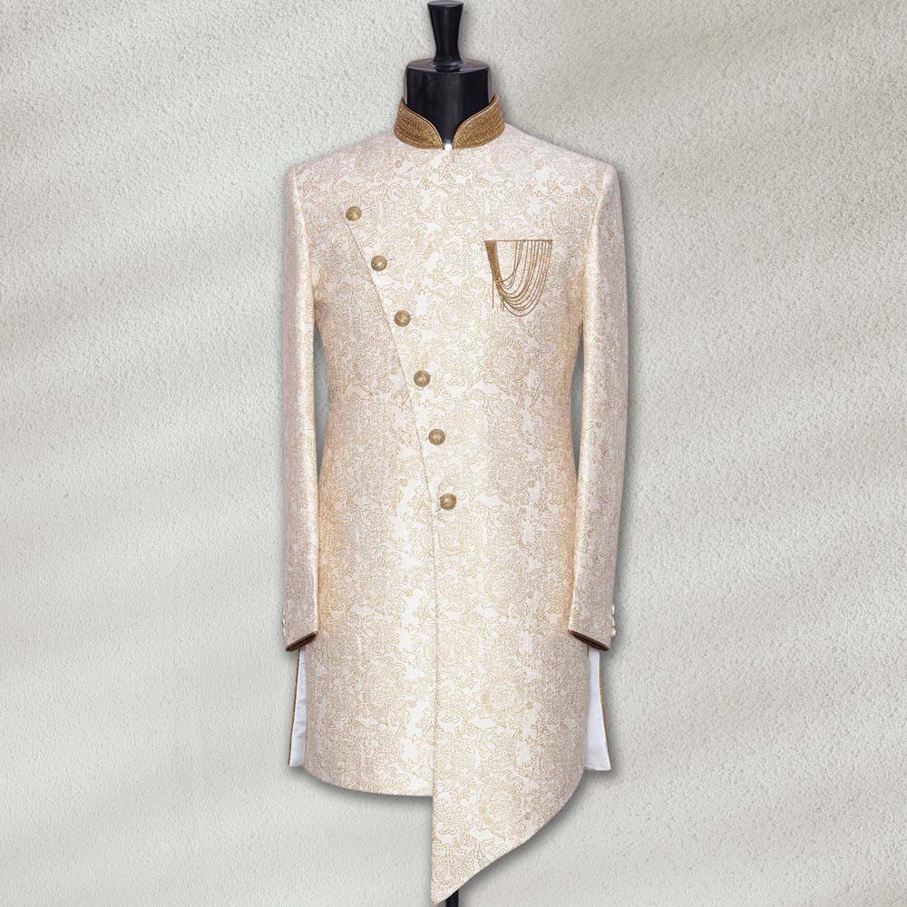 Self-printed off-white jamawar sherwani featured thread stitch detailing on the collar with golden moderate buttons and a classy brooch chain.