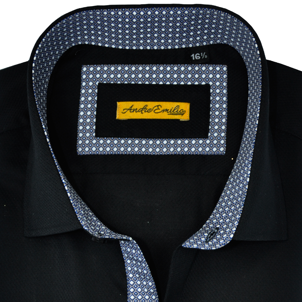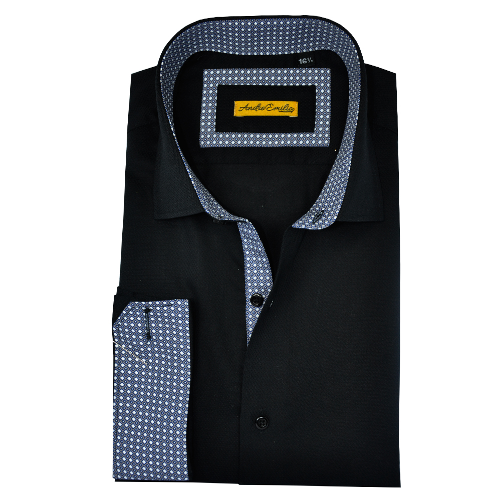 Astonishing black self print 100% cotton shirt. Inside trim of white dots on grey color contrast with the black shirt color, slim fit, a front button fastening, full sleeves, Ideal for formal occasions, easy to iron.