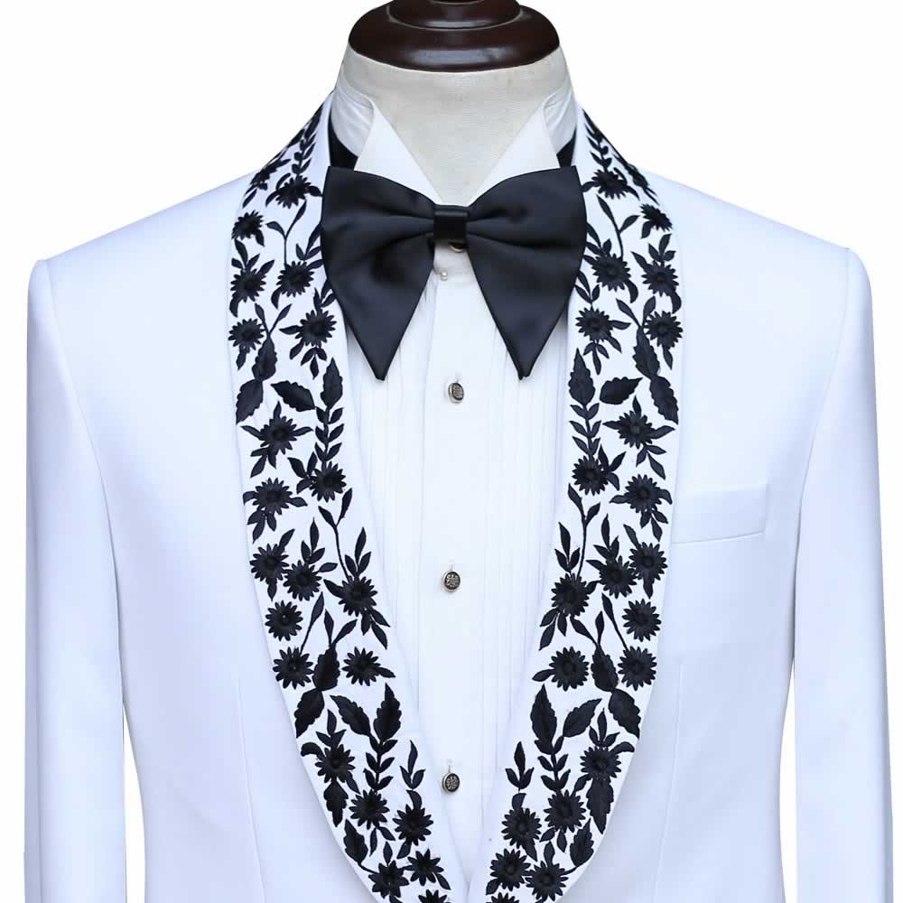 A white tuxedo is a popular color choice for grooms. Andre Emilio’s white groom tuxedo is perfect for your wedding day. This tuxedo suit features a white lapel having a classic floral black embroidery enhance your look. It’s made from tropical fabric. The Knot can help you find the perfect white tuxedo.