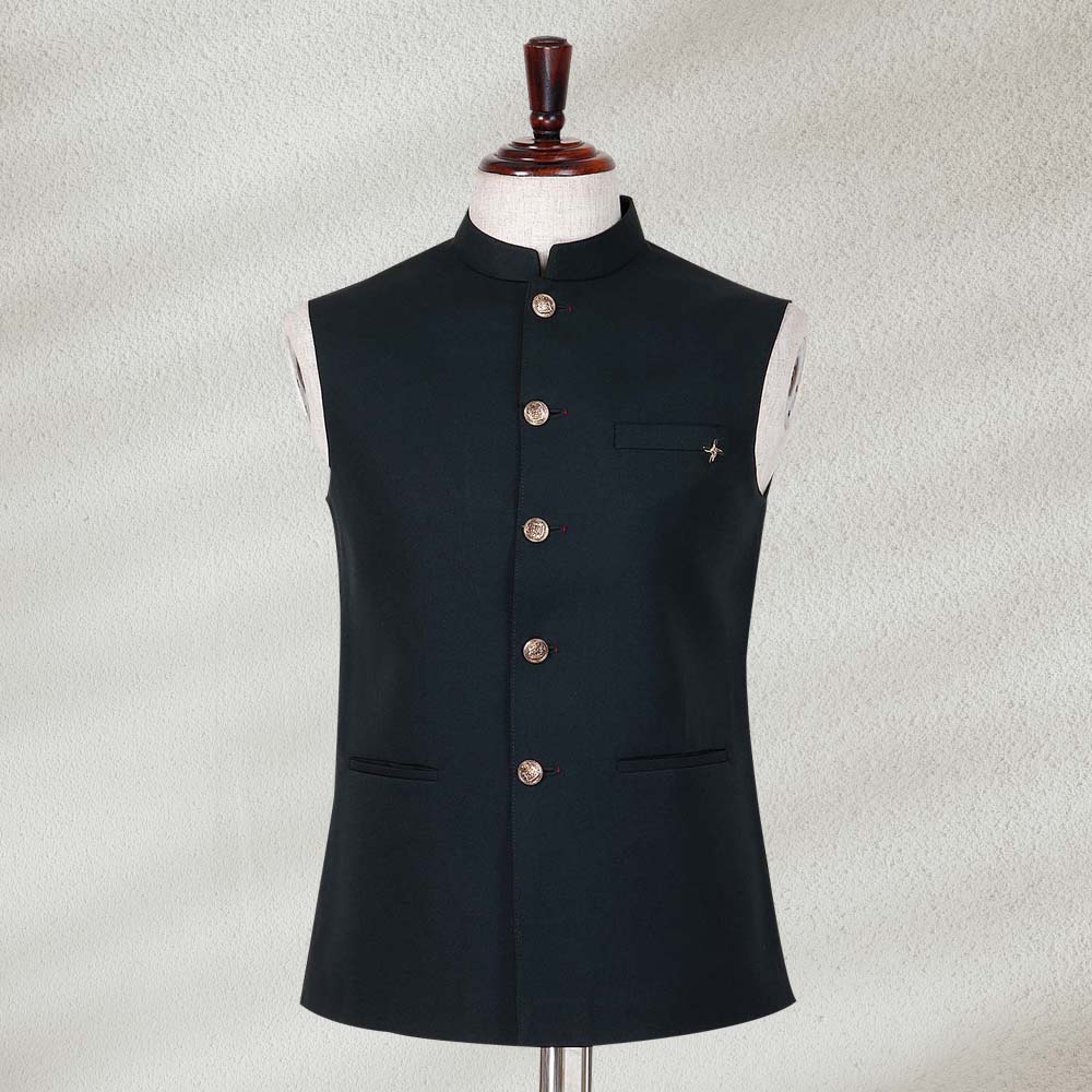 Festive with this solid bottle green supreme fabric waistcoat. It has stand collar, sleeveless, vented hem, welt pocket and full buttoned placket.