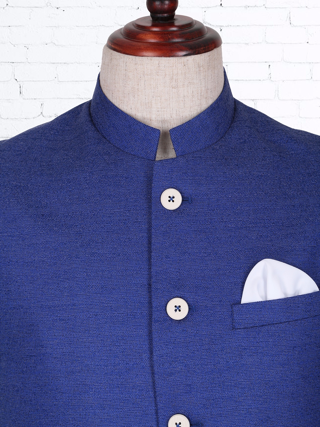 Solid royal blue wedding wear waistcoat in Italian fabric. It has stand collar, full button placket and welt pockets with pocket square and vented hem.