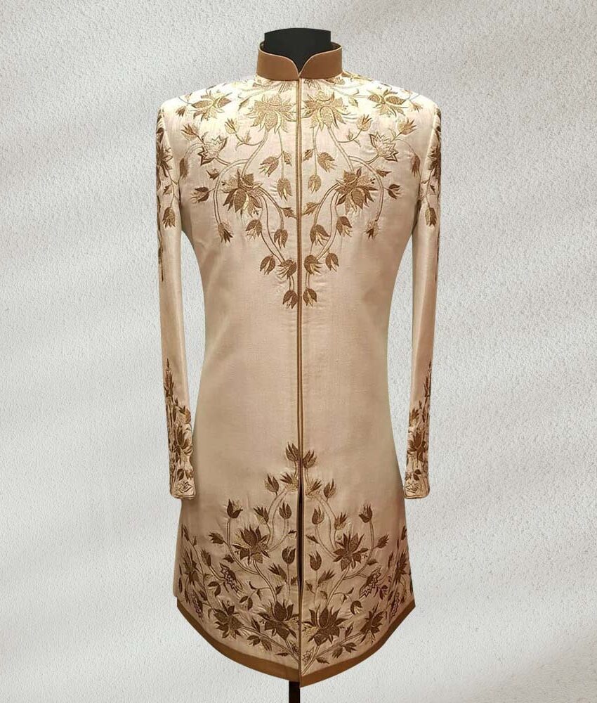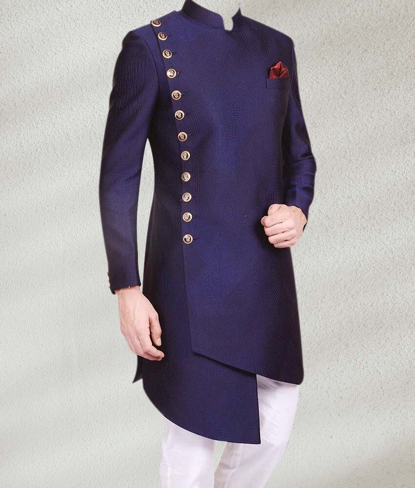 Navy blue plain tropical sherwani featured with embellished hand detailed embroidery on front and shoulders with light embroidery touch on sleeves.