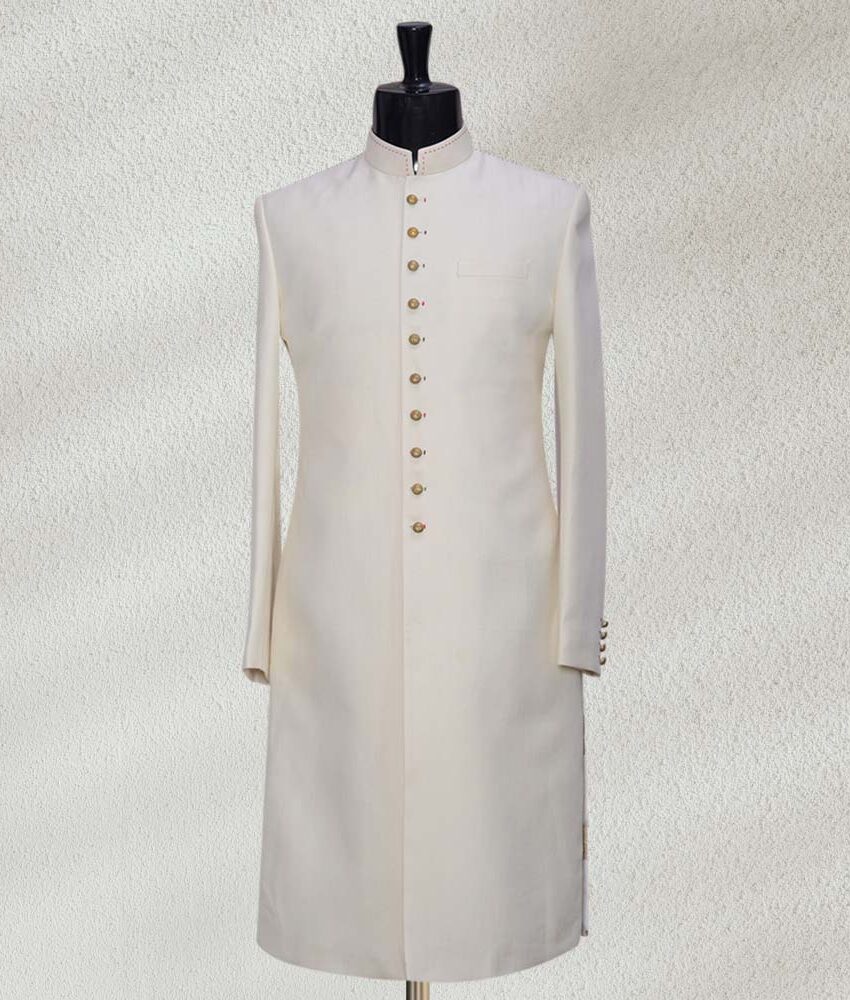 Self-printed off-white jamawar sherwani featured thread stitch detailing on the collar with golden moderate buttons and a classy brooch chain.