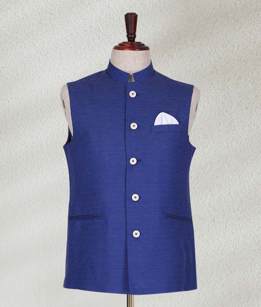 Simple and sober look in this plain black hue terry rayon waistcoat with chinese collar, full button placket and sleeveless pattern.