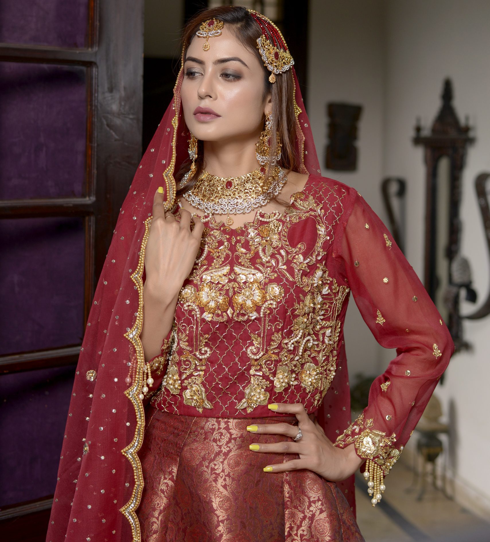 Organza fully heavy hand embroidered choli (dapka ,nakshi,gota,zari,pearls,stone,sequins, etc),jamawar lengha with can can(net underneath), fully hand embroidered cutworks dupatta.
