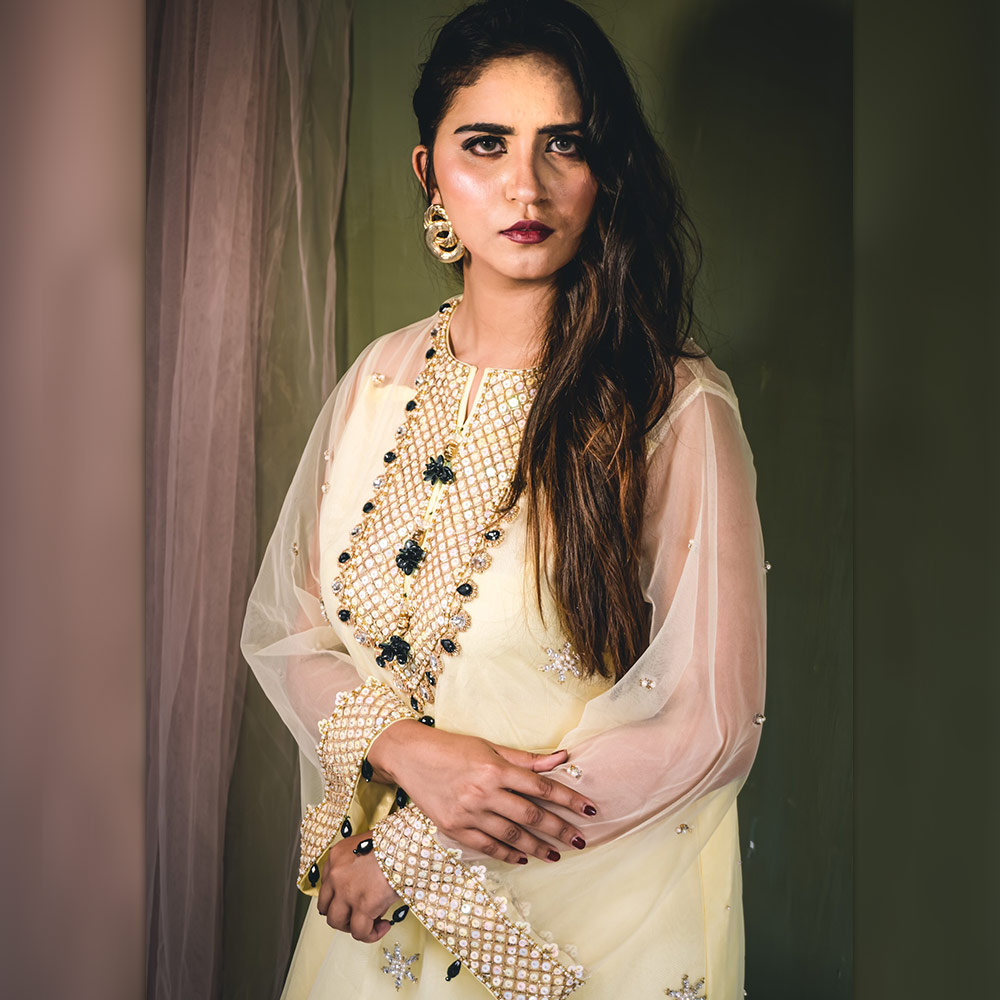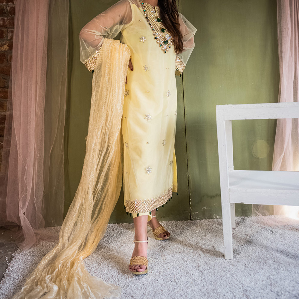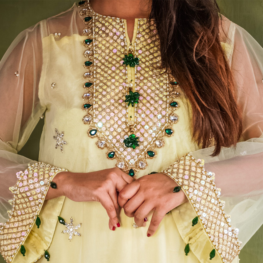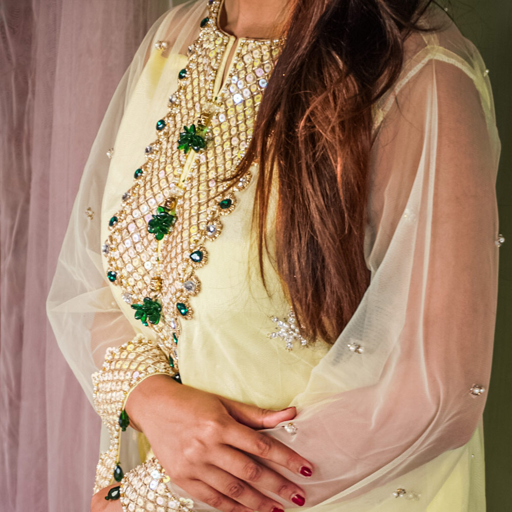 Net dress beautifully embellished with shiny sequence, pearls, dabka, and stones.