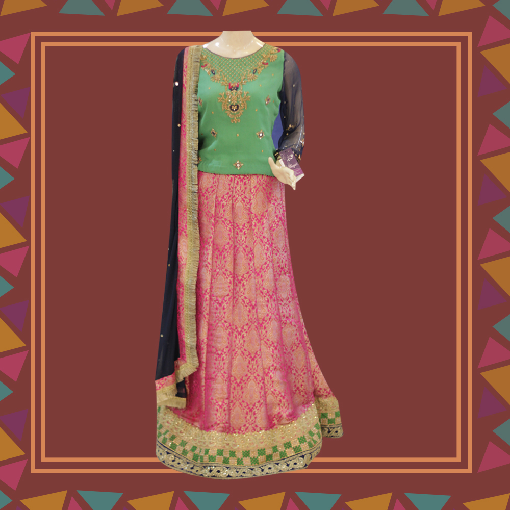 Look variant in your casual parties and weddings with this blue & golden back tail dress. Pearls and Corra dabka work on front & sleeves gives this dress an eye catching look. Sequence net fabric used in dupatta and trouser paired with simple jamawar including cut work.