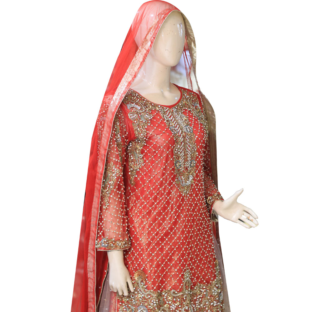 Cora dabka work red choli with golden pearl net trouser and elegant net duppta is going to give bride more delightful and ravishing look on her big day.