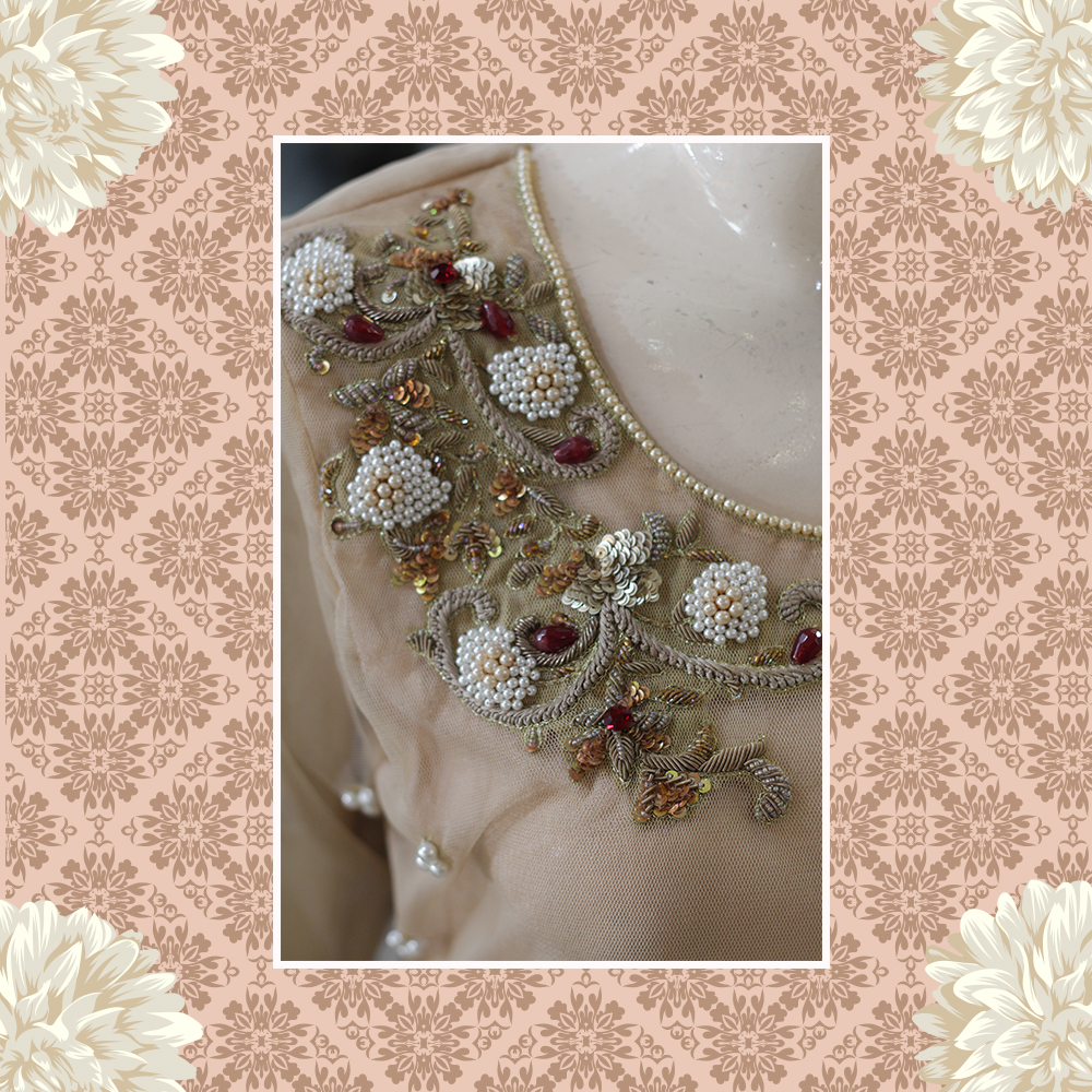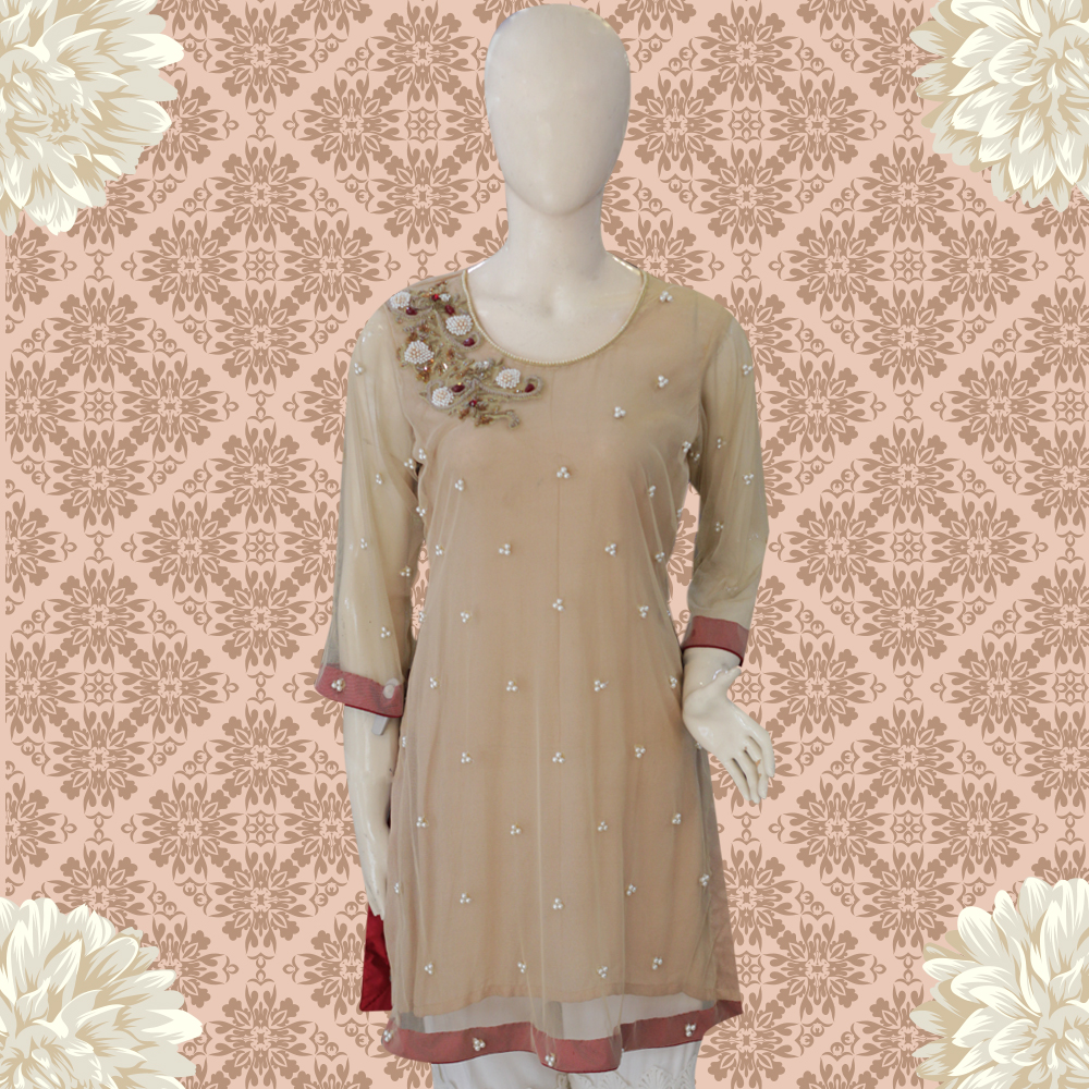 Modern traditional net western cut 2-layer shirt lightly diagonal daman with pearls. Side shoulder fancy motive matches with the golden color of the dress give an eye-catching look to this dress