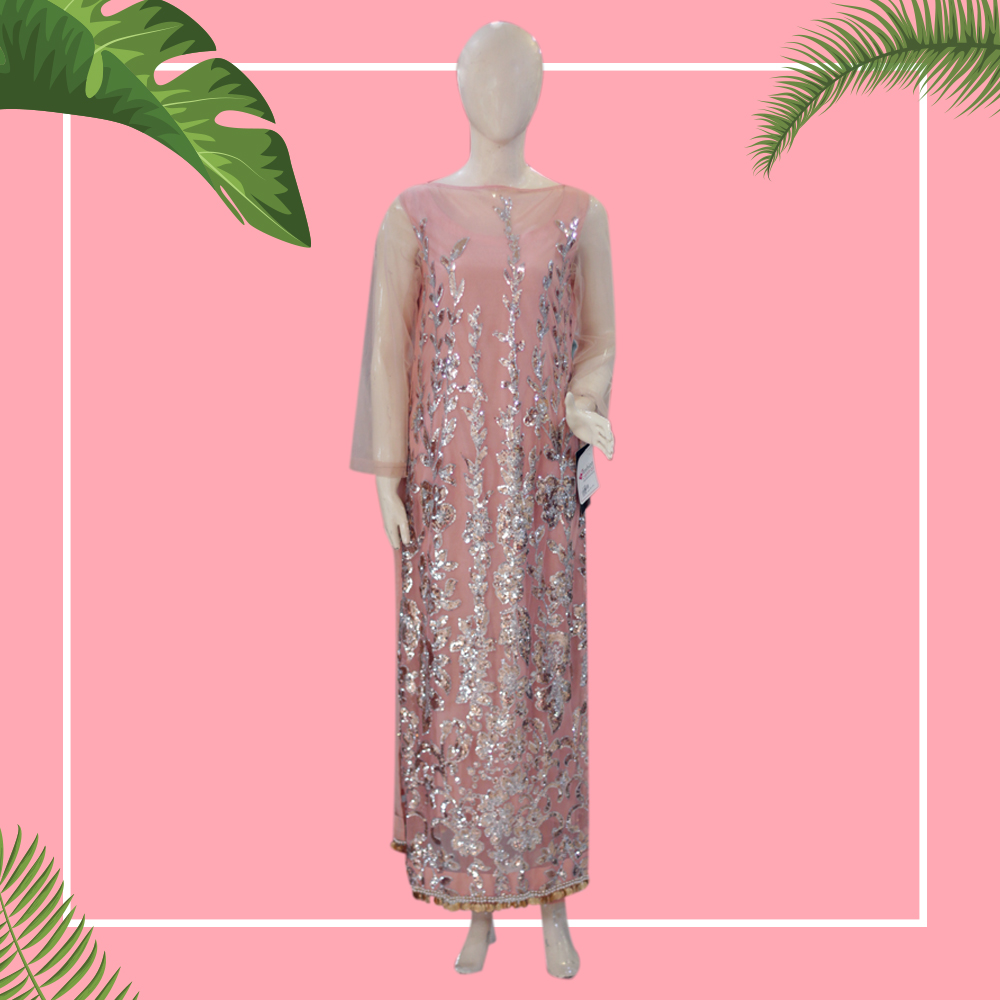 Nowadays the trend is all about long shirts with trousers. For Casual weddings events and party wear peach long shirt and trouser is the best choice. High-quality net Fabric used in this dress with sequence work on Neckline and all over the dress. Golden Color