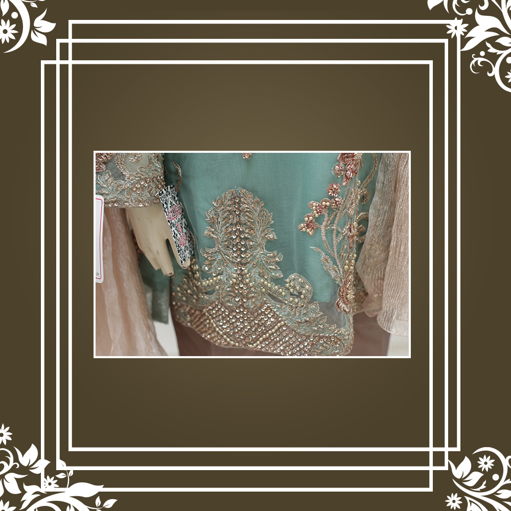 Look modest on your casual and wedding events with the Beautiful ferozi net straight shirt. The shirt features cut dana work all over the shirt that goes best with the beautiful ferozi color. The shirt is paired with exquisite skin colored trouser So brighten your event with this gorgeous dress