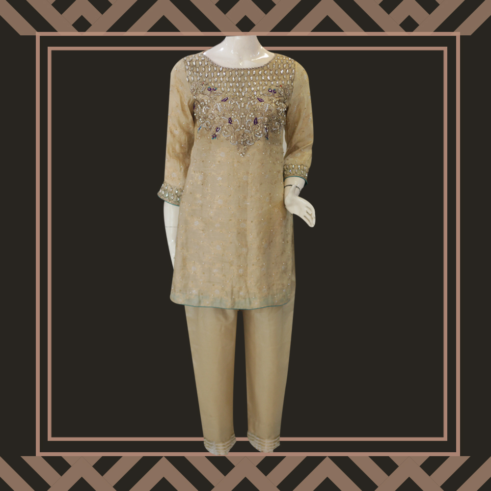 Dazzling cotton shirt in golden color. The dress is classical concoction of Beautiful pearls sitara and kora dabka work. Contrast of pearls & stone with cotton net fabric gives phenomenal look to this traditional dress