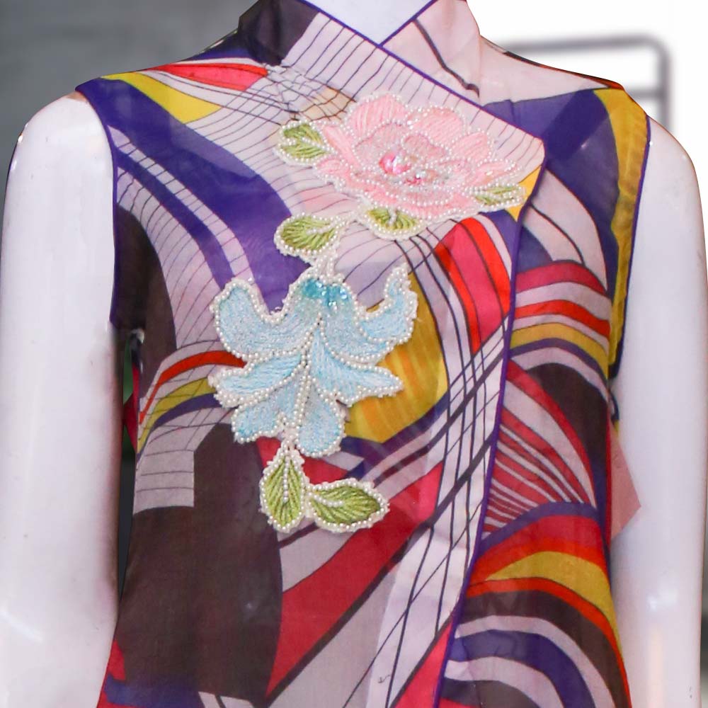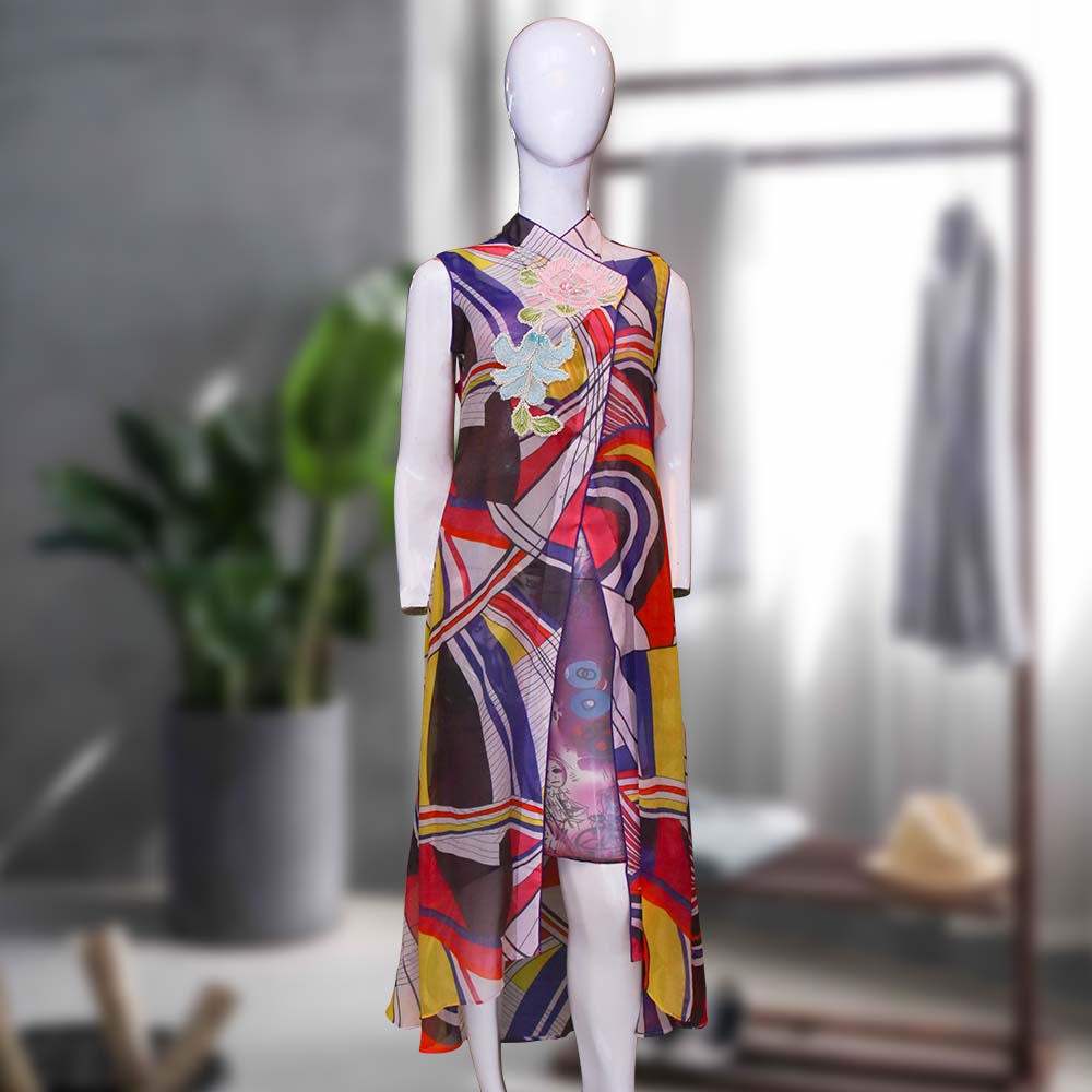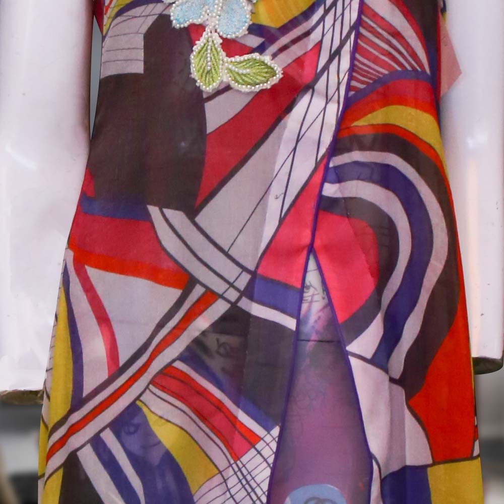 Multi-colored angrakha adorned on printed chiffon with delicate motif work. This versatile dress can be worn on any semi-formal event.