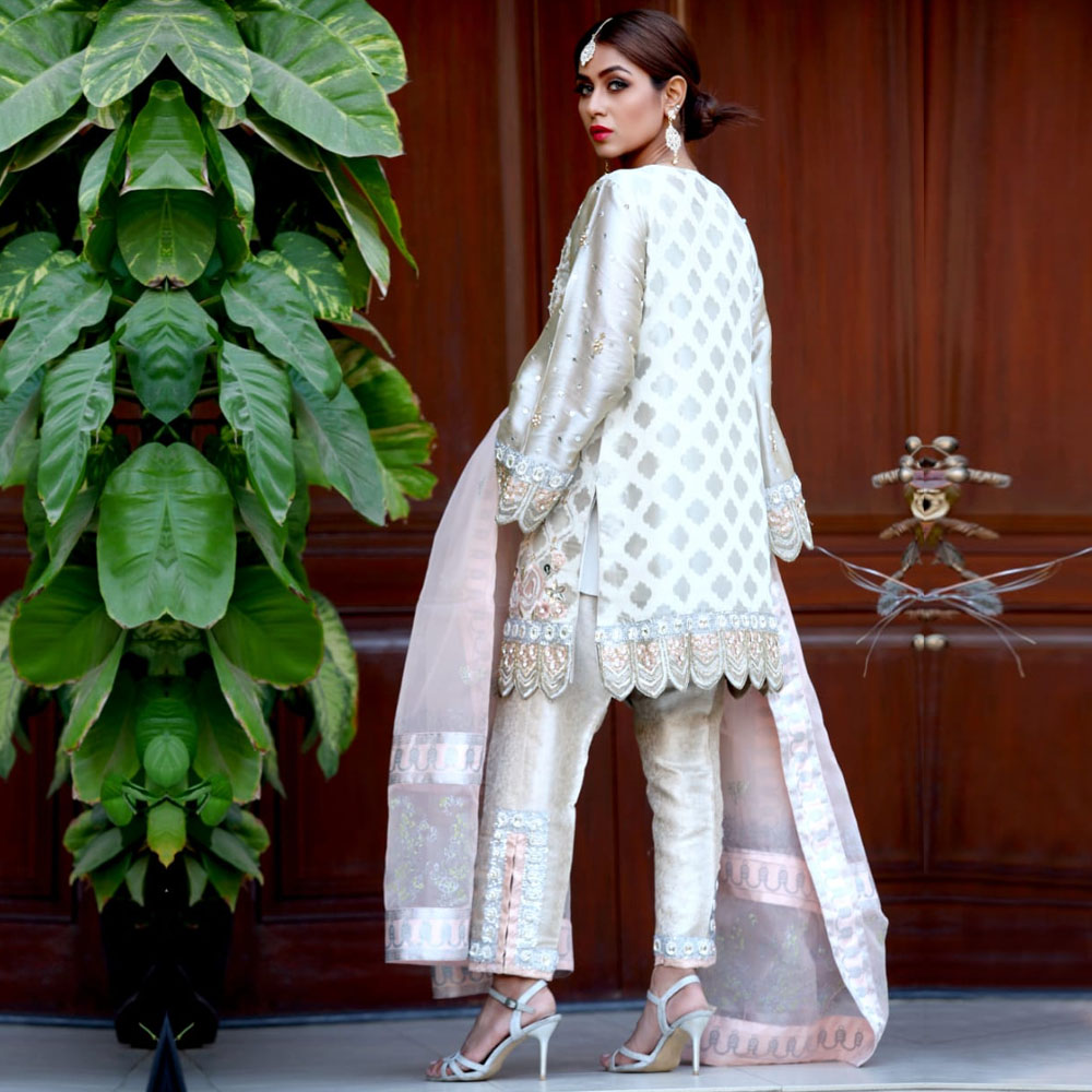 Become an enchanting mystery in this magnetic Lilac colored dress. Beautified with attractive Zari, thread and stone work as shown, also paired with jamawar trouser and Block printed dupatta. Ideal for casual outing & weekend get together. Team it with matching leggings or jeans, high heels and fashionable accessories to look more attractive. This attractive dress will surely fetch you compliments for your rich sense of style.