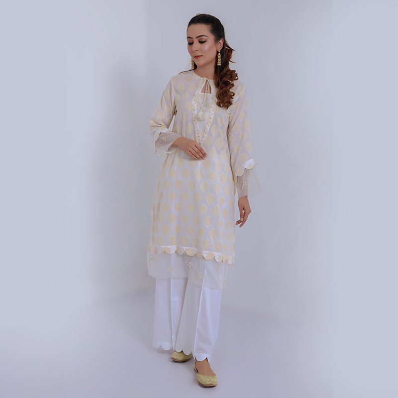 Aafreen is an off-white lawn Jacquard dress beautifully embellished with pearls and beads. It is paired with palazzo trousers and net dupatta with pearl detail.