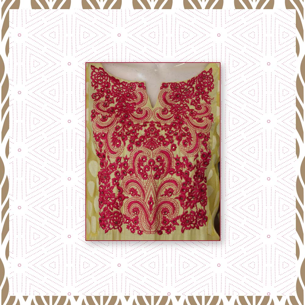 The designer made yellow shirt a perfect choice for party wear. The shirt is designed with neck embroidery, Sleeve borders and thread work on neck and borders.