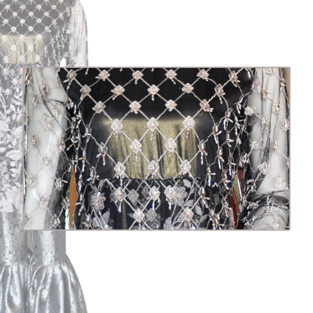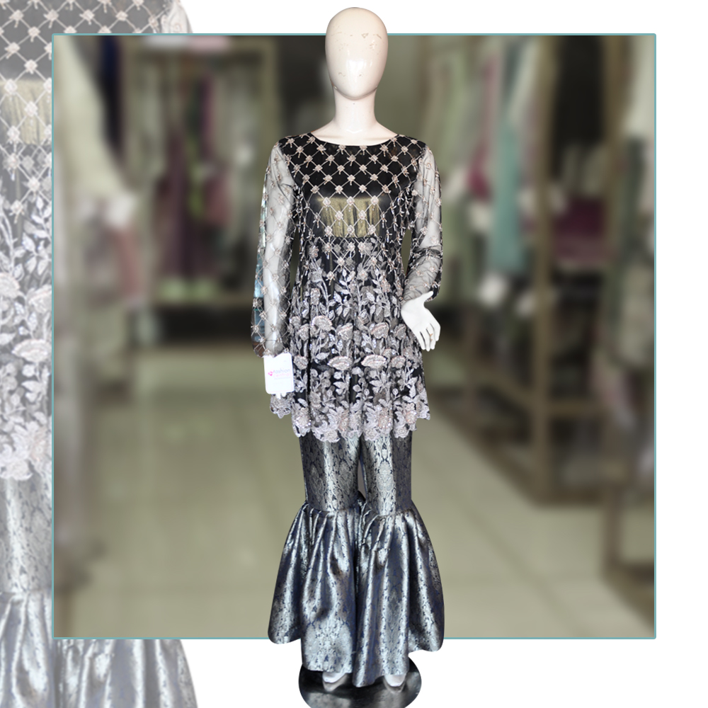 Look absolute in this elegant black and gold dress. Featuring pearls and cut dana work on all over the shirt paired with simple jamawar garara. Net and jamawar fabric are used in this peplum dress to maintain comfort. Style this up for your Saturday night out or for when you’re partying in the fields.