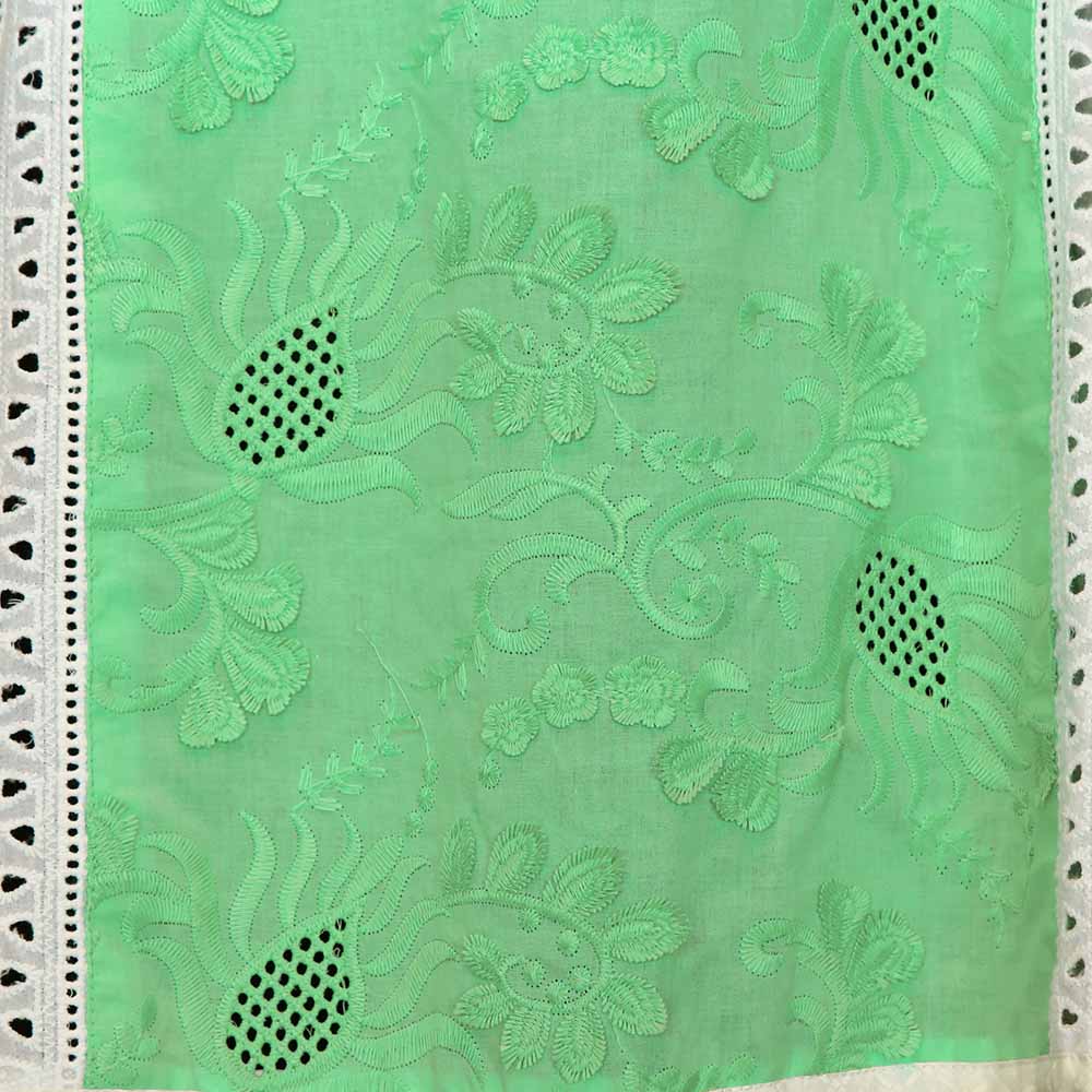 Chicken Green Cotton elegantly designed frock with Machine Embroidery Work having an amazing tail. Just buy it and have a stunning look.