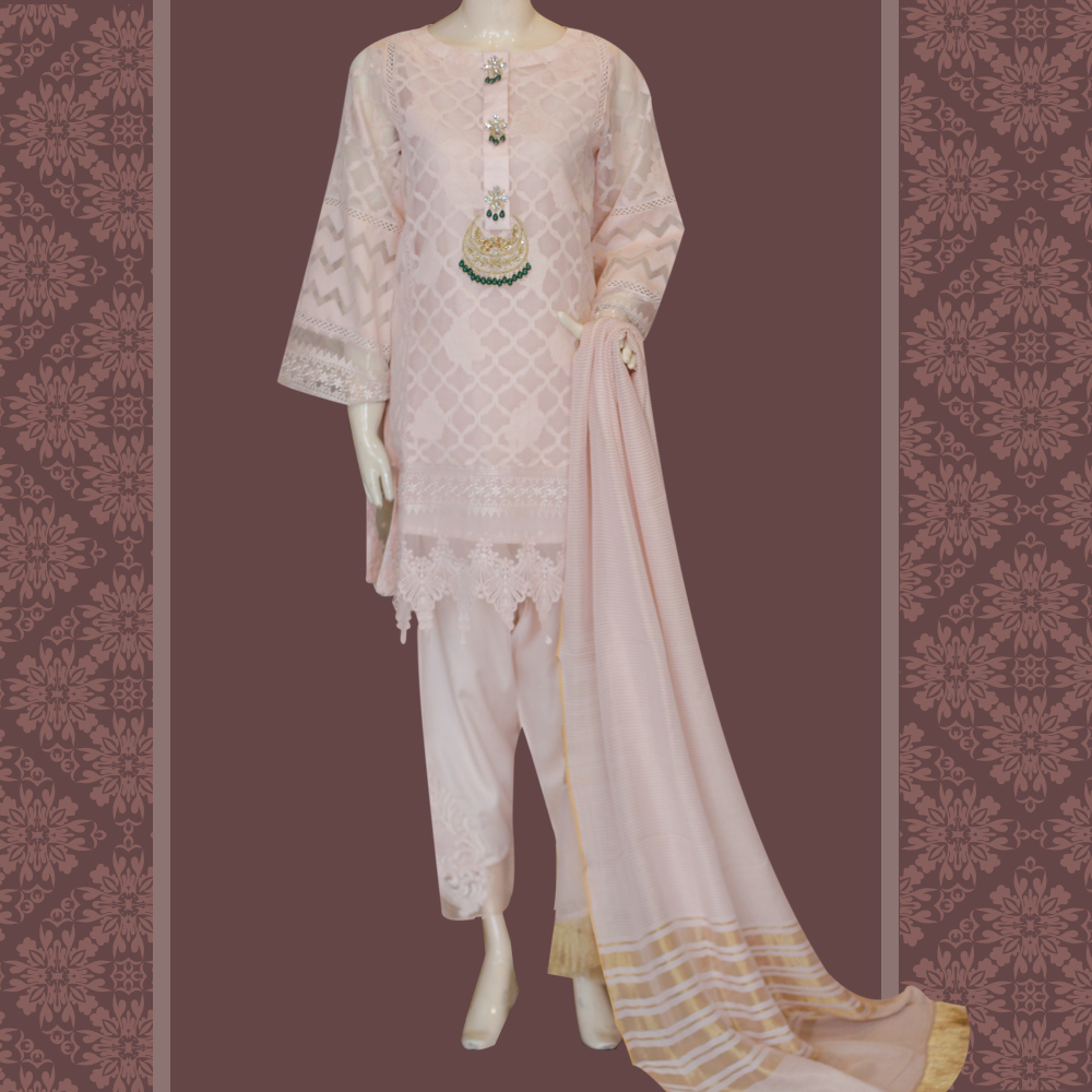 The exquisite and extremely classy yet stylish light pink straight shirt highlighted with elegant motive on neck added with cora dabka and stone work is surely a perfect party wear.