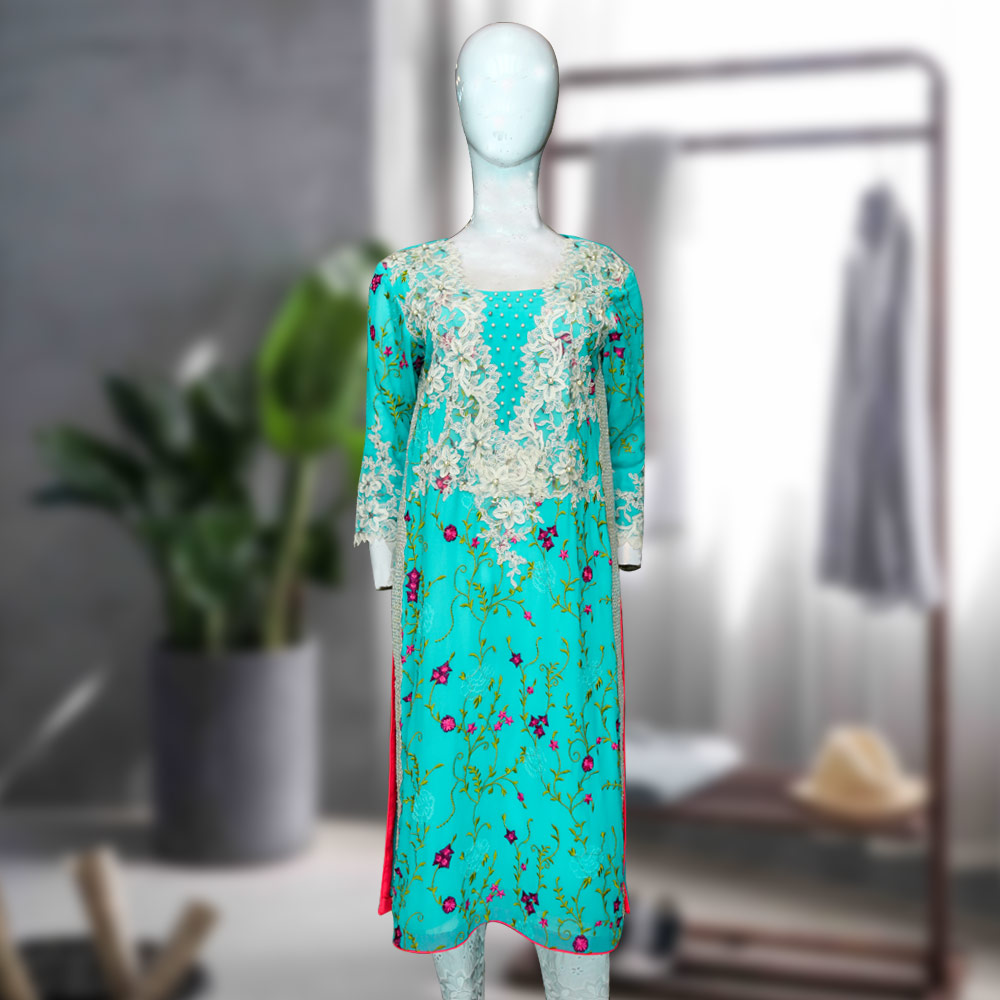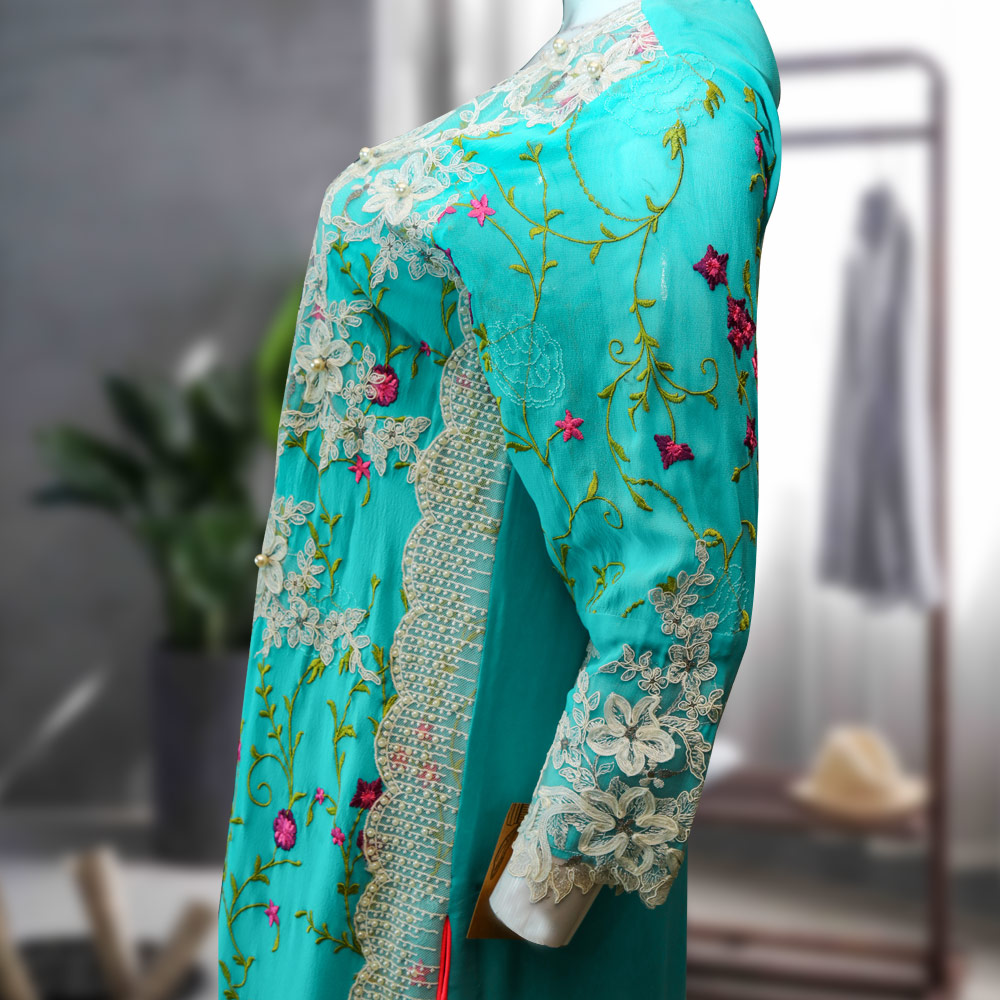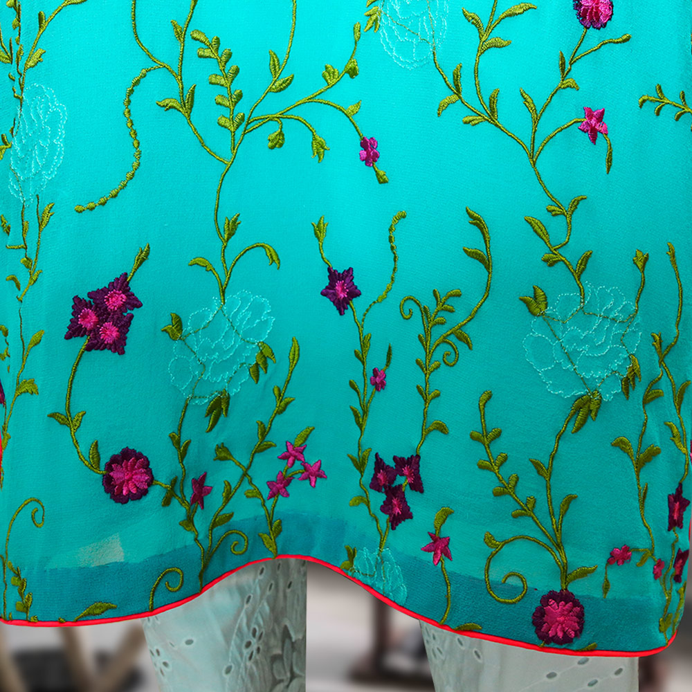 Try this multi embroidered ferozi shirt in grip chiffon fabric. A perfect color to wear at evening parties or semi-formal occasions.