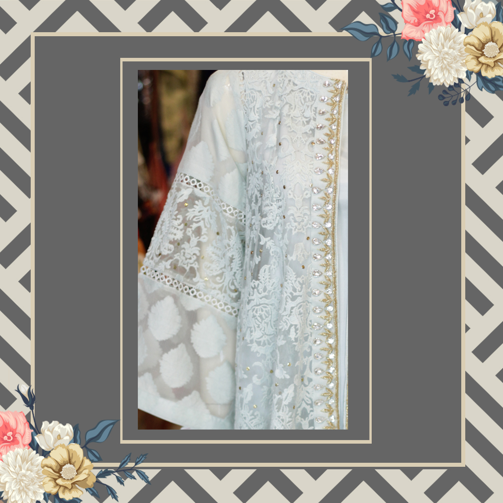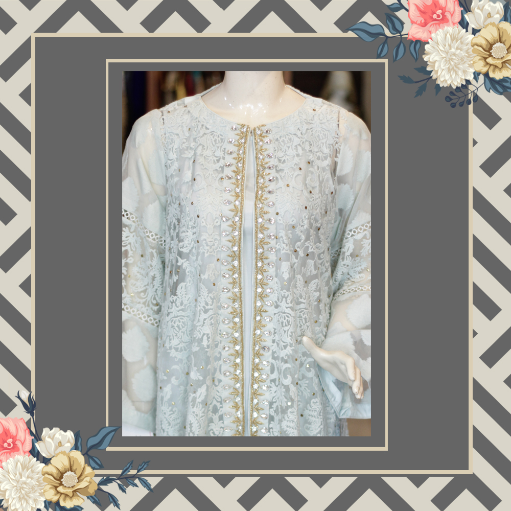 This classy gown is paired with net patch trouser which will surely going to enhance your overall look.