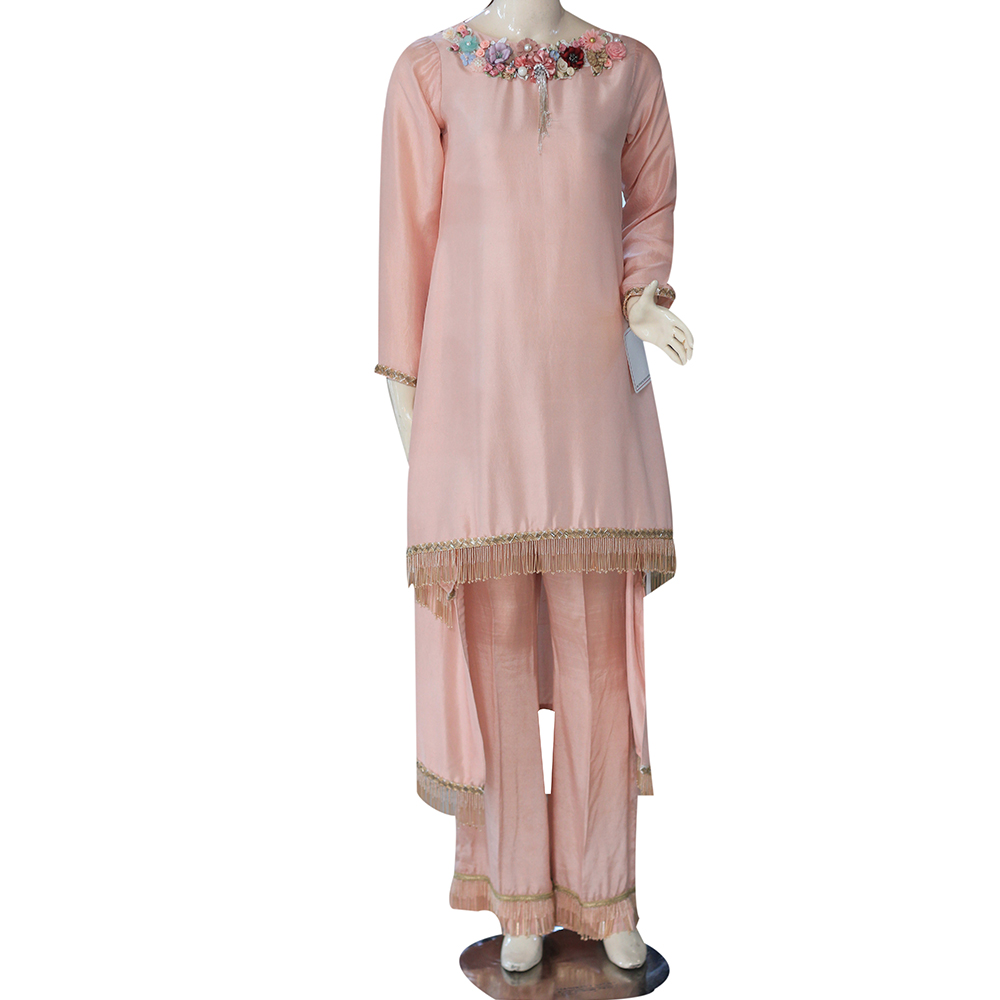 Peach raw silk back tail is designed with sophistication and delicate flower work around neckline.