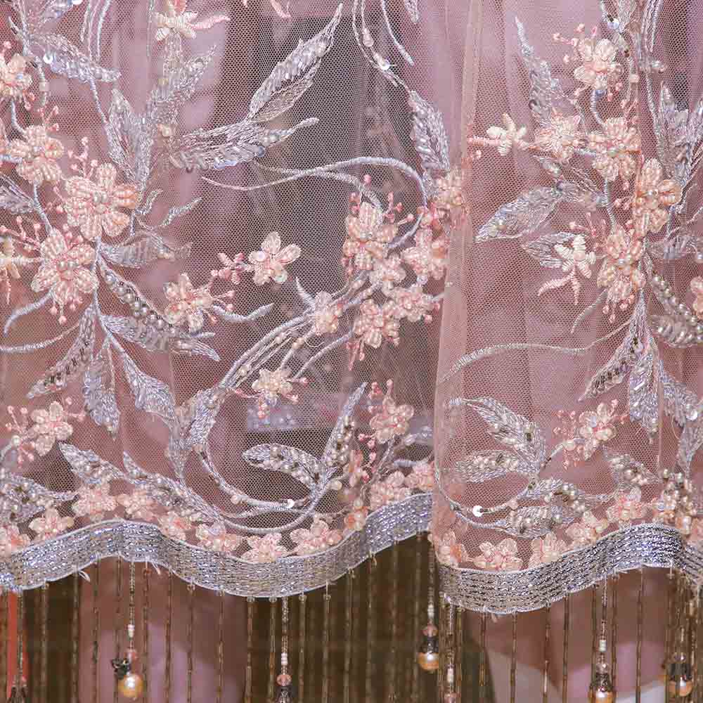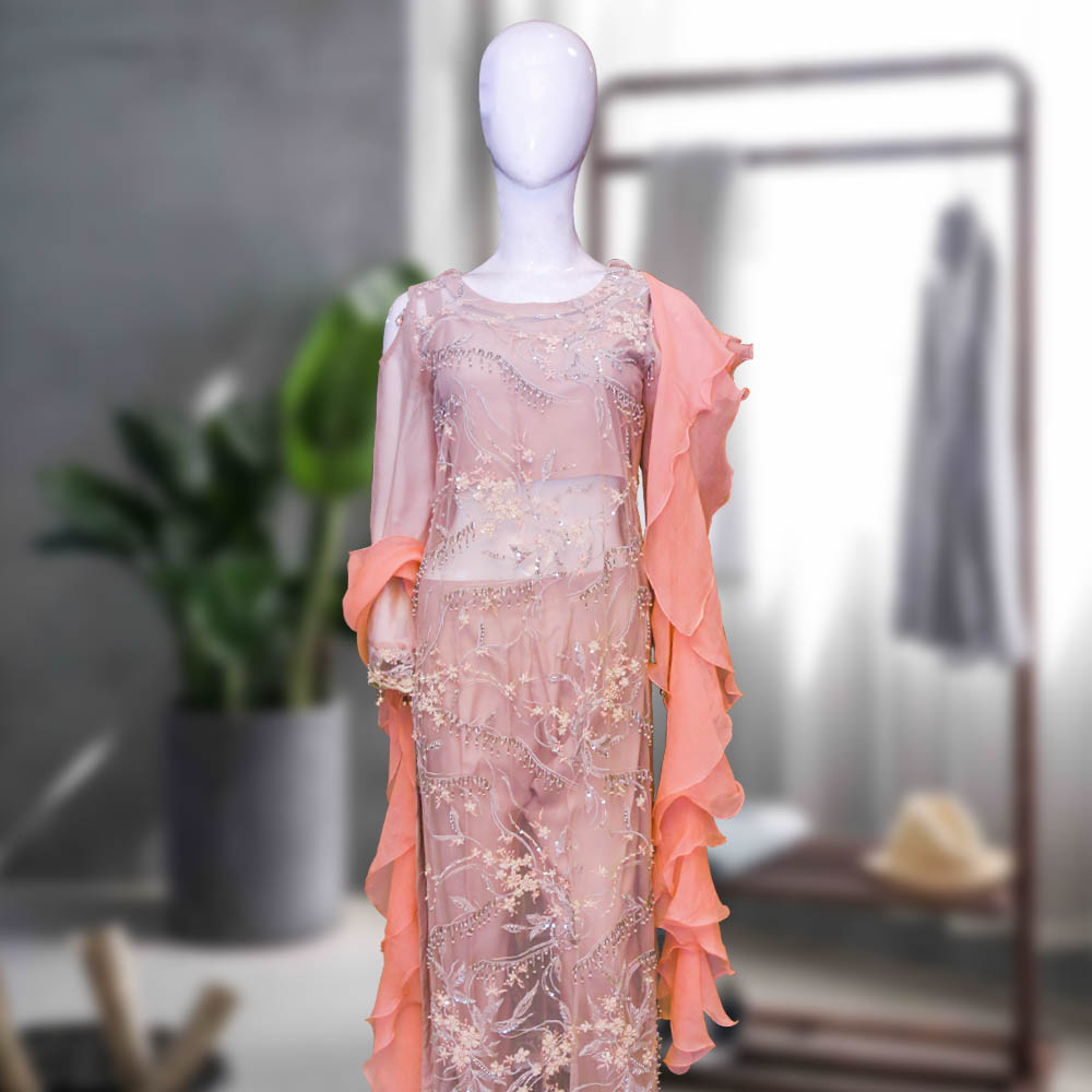 Pink net long shirt with trouser and organza grip silk dupatta. The beads and stonework on this outfit makes it ideal for semi-formal occasions.